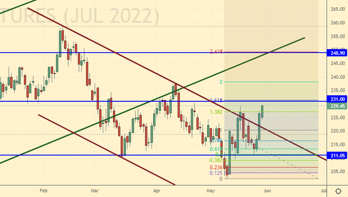 Growth scenario: we are considering the July futures, the expiration date is July 19. Our perseverance is bearing fruit. We’re going up. Target 248.00. We hold longs.