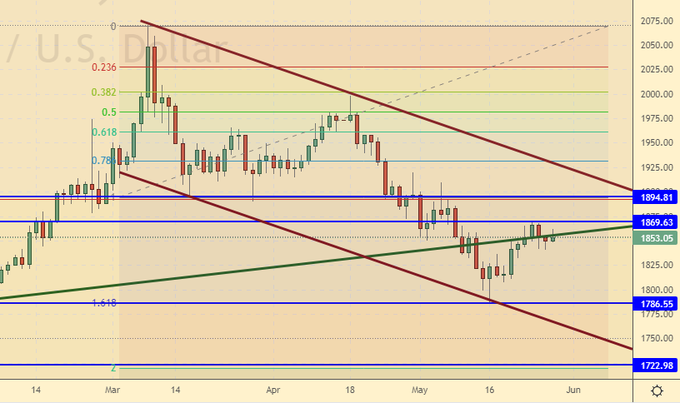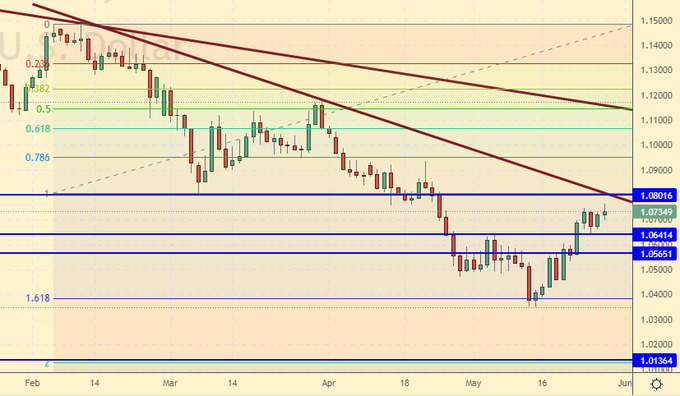 Growth scenario: it makes sense to close longs at current prices. Growth to 1.1000 is possible, but it is unlikely to take place before the meetings of the ECB and the Fed (June 9 and 15, respectively).