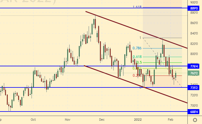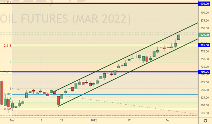 Growth scenario: March futures, the expiration date is March 10. The market is growing due to bad weather in the US. A move to 930.0 cannot be ruled out. You can buy only on a rollback to 800.0.