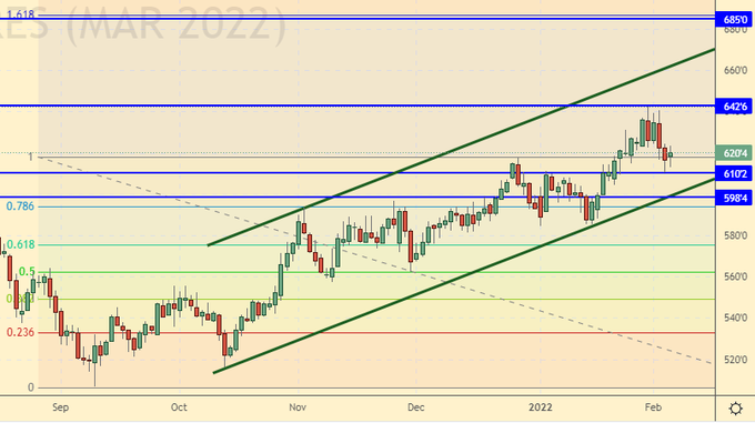 Growth scenario: March futures, the expiration date is March 14. From the level of 600.0, you can go long. The current levels are acceptable for purchases, but to a lesser extent.