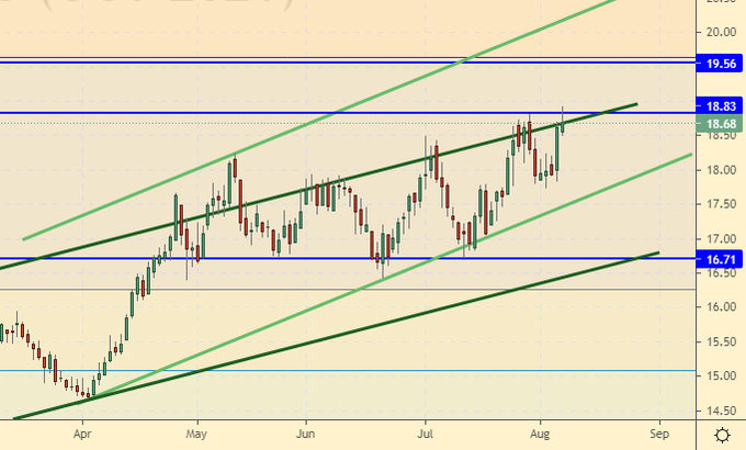 Growth scenario: considering the October futures, the expiration date is September 30. We continue to dream about 19.50. The current state of affairs suggests continued growth. We move the stop order along the trend.