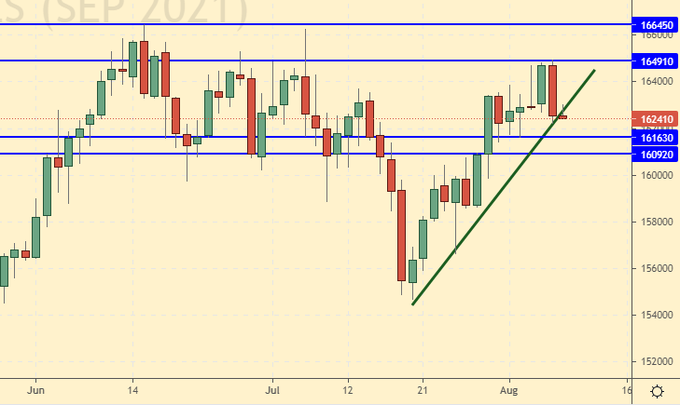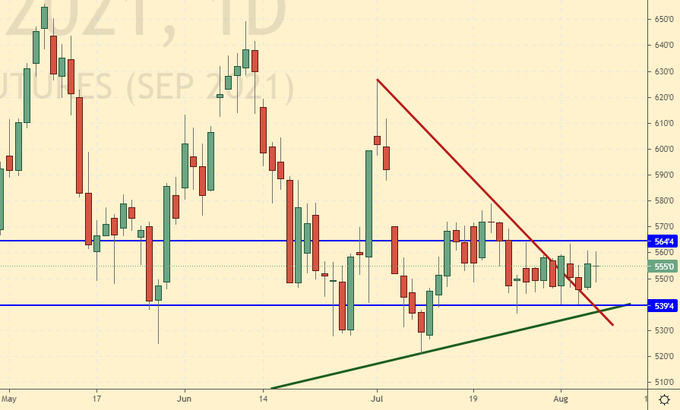 Over the past week, the difference between long and short positions of managers increased by 12.3 thousand contracts. At the same time, the price increased by 19.6 cents. Before the release of the USDA report, speculators are betting on growth. This keeps the prices up. Growth scenario: September futures, expiration date September 14. The situation is not easy. The market may surprise you in August and continue to grow.