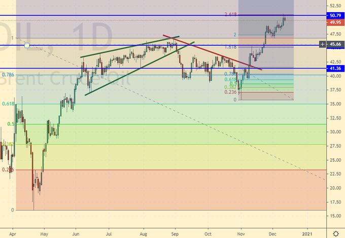 Growth scenario: January futures, the expiration date December 21. We see an attempt to pass to 49.00. There is still room for growth, but it is minimal. The current levels are too high for purchases. We are out of the market.