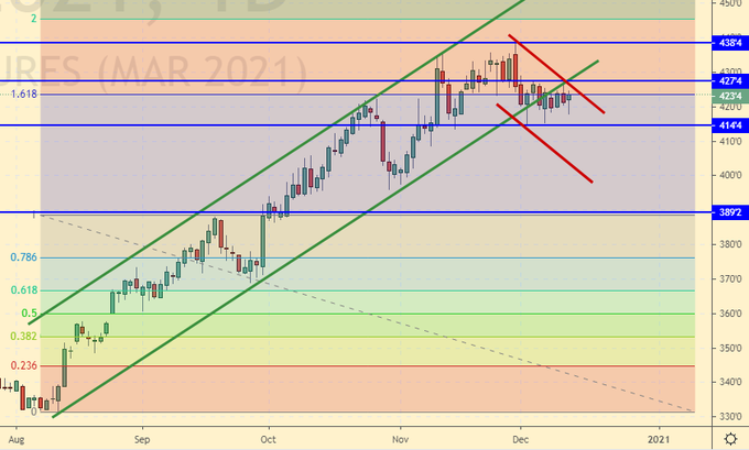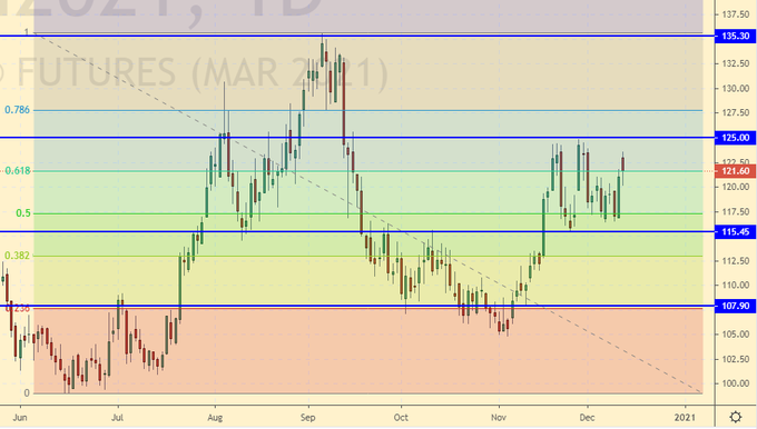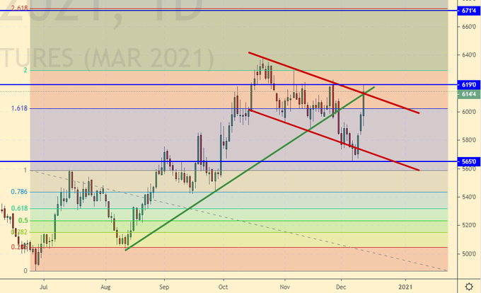Growth scenario: December futures, expiration date December 31. We don’t see any sense in buying here. From the point of view of technology, there is nowhere to grow further, a pause is needed. From the point of view of fundamental analysis, the positive from the start of vaccination is already in the price.