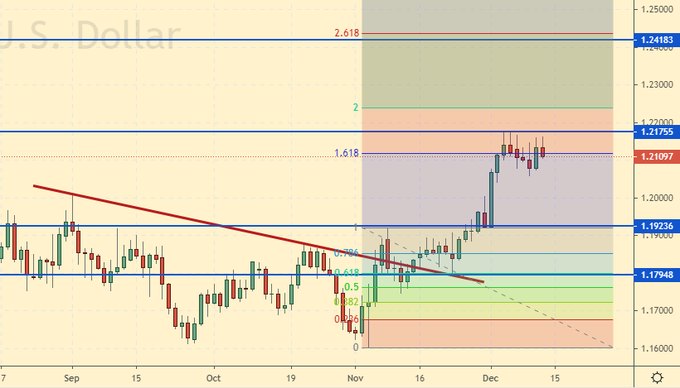 Growth scenario: we have two central events next week, on Monday — the electoral vote, on Wednesday — the Fed meeting. They will be surely appreciated by speculators. A corrective move to 1.1930 may await us, but below the pair is not visible.