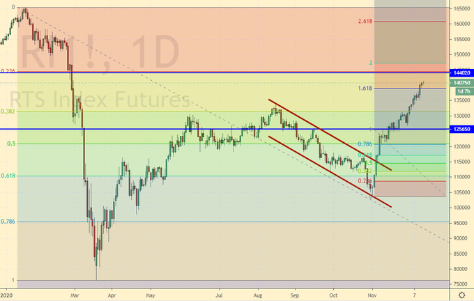 Growth scenario: the market continues to grow without recoil. It is possible that we will touch 144000 after which a full-fledged rollback will begin. It is also impossible to deny the possibility of growth to 160,000. However, as soon as the electors vote for Biden, the Russian market is highly likely to react to this event by dropping by two or three thousand points. It is not excluded that the fall will begin on Monday before the vote, as the US Supreme Court did not consider the application from the state of Texas on election irregularities, which means Biden’s victory in the voting. Despite the temptation, we do not recommend opening new buy positions as a result of a possible rollback.