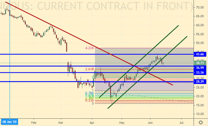 Growth scenario: June Futures, the expiration date June 30. Prices came out of the growing channel. We will expect a drop by 30.00, where we could buy.