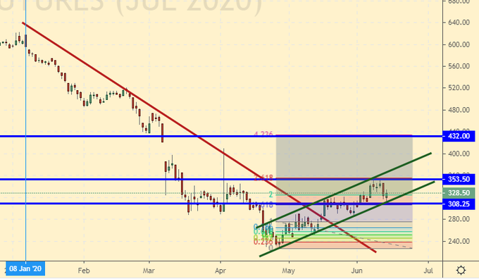 Growth scenario: July Futures, the expiration date is July 14. The market gives us an opportunity to keep the longs opened from 315.0 and 325.0. It is possible to buy. Place the stop-order closer.