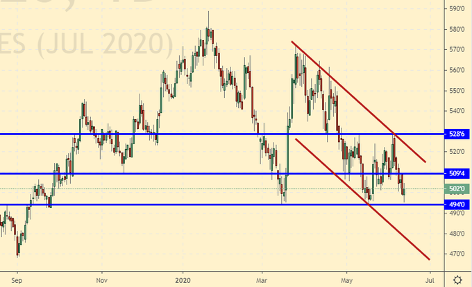 Growth scenario: July futures, the expiration date is July 14. Prices managed to consolidate below 510.0, which creates prerequisites for the further decline. We don’t think about buying yet.