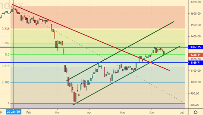 Falling scenario: it is unlikely that in 2021 companies will pay any dividends based on 2020 results. All participants understand this, so the downside move will be perceived quite calmly. Sell if it falls below 1230.