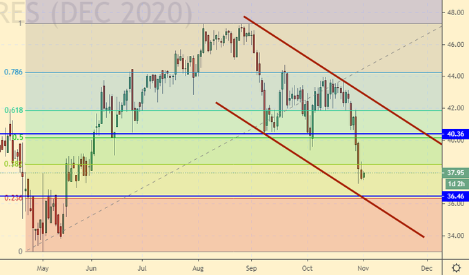 Europe closes on lockdown. Germany, following the UK, introduces restrictive measures from November 2 for a month. The losses to the economy are tentatively estimated at 20 billion euros. It will not be surprising that oil prices will continue to fall against such a background. We can see the 35.00 Brent level by Friday.