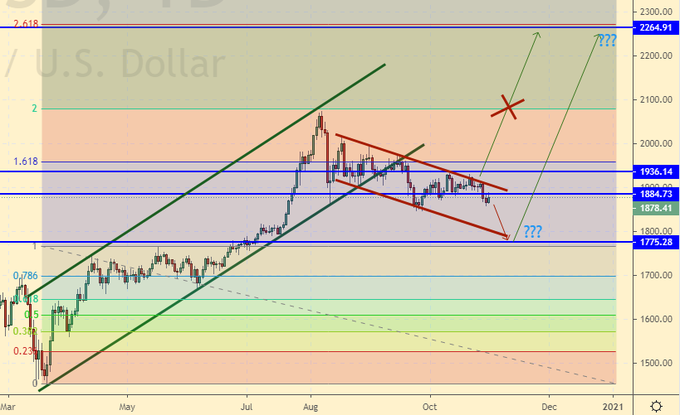 Growth scenario: keep failing. If the market rises above 1936, we will buy. Biden’s victory could lead to a rise in gold, as Democrats are inclined towards stronger stimulus programs.