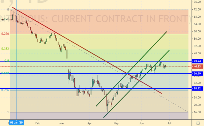 Speculators tried to break above 44.00, but without succeed, which makes it possible for a sharp drop in prices if they will drop below 40.00, since stop-loss will work.