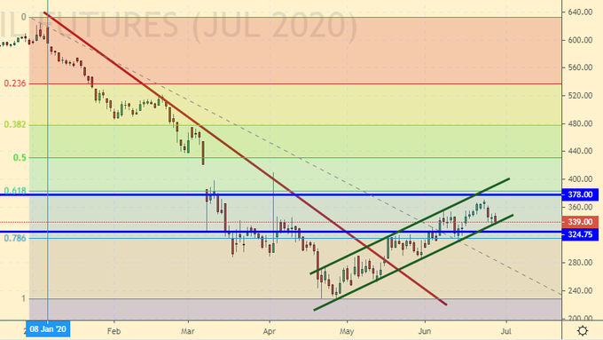 Growth scenario: July futures, the expiration date is July 10. Bulls need to keep the level of 340.0, otherwise prices will exit the growing channel and there will be a threat of return to 250.0. If you want to buy here, only at 1H intervals.