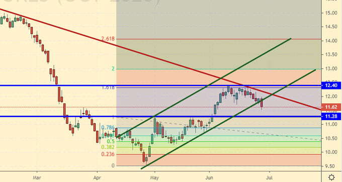 Falling scenario: shifting to October futures. In July’s one, prices on Monday closed below 12.00, which should have pulled you into the sale on our recommendation. We will keep this short. In case of a return by 12.00 it is possible to sell.