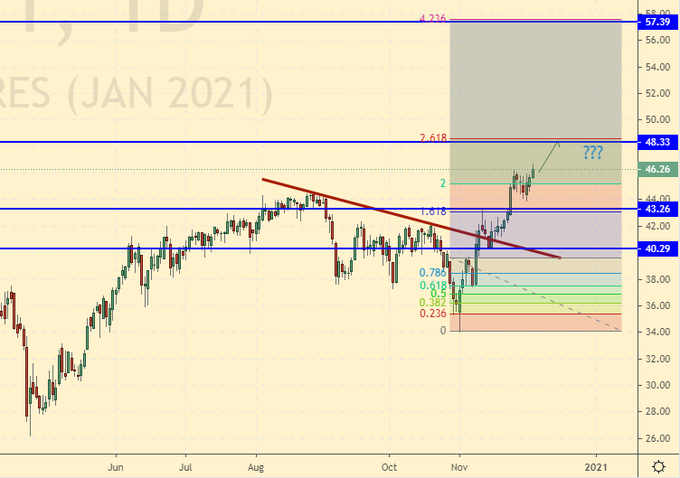 Growth scenario: December futures, expiration date December 31. The goals have been achieved. Those who wish can stand still, but at the same time it is worth tightening stop orders, but for the rest who bought from 42.00, we recommend closing longs. Falling scenario: here we need to sell up to the level of 52.00. We have the right to count on a correction to 45.00.