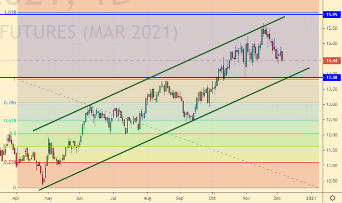 Growth scenario: March futures, expiration date February 26. Expect a fight in the 13.90 area as the bulls should defend the lower support line of the rising channel. If it is taken, then we can fall to 12.50. We are not buying yet.