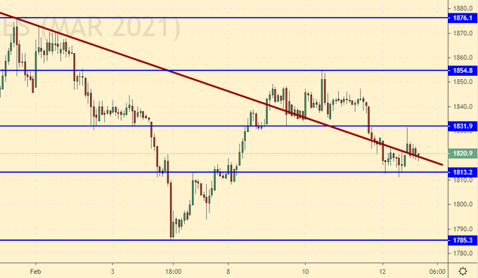 На утренних торгах в Азии неопределенность. Можно лишь отметить, что мы не падаем, значит, вариант ослабления доллара остается в головах части трейдерского сообщества. Отметим, что рост выше 1860 приведет к тому, что на рынок придет та часть покупателей, которая сейчас находится в деньгах.