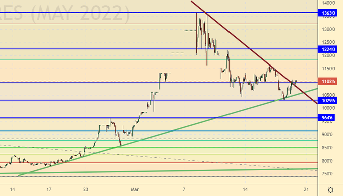 Пшеница снова идет наверх. Запущенная утка в западной прессе о том, что есть шанс на мирное урегулирование конфликта сыграла свою роль: кто-то смог купить подешевле. Сейчас есть предпосылки хода к 1250.0. Более сильный рост будет возможен если USDA резко понизит свой прогноз по валовому сбору в мае.