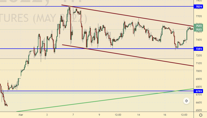 Неагрессивное движение в канале может разродиться очередным всплеском. Наверняка на фоне роста цен фермеры и трейдеры придерживают зерно. Всем хочется более высоких уровней на фоне инфляции и непонятных перспектив. Покупатели в этом году будут выжаты досуха.