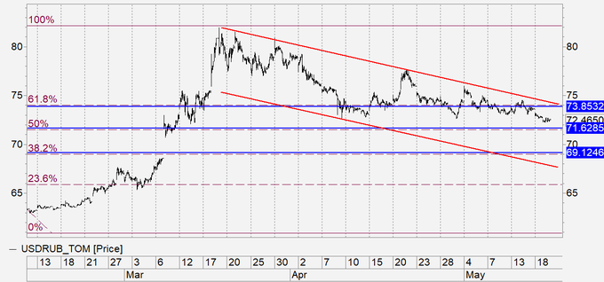 Нефть помогает рублю укрепляться. Не исключено, что прежде чем пройти ниже 71.60 мы вернемся к 73.80. Если это действительно произойдет, рекомендуем продавать пару.