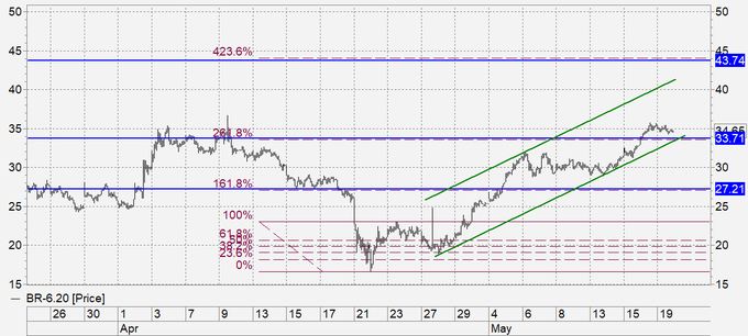 Продажа: в случае падения ниже 33.50. Стоп: 34.60. Цель: 27.30.