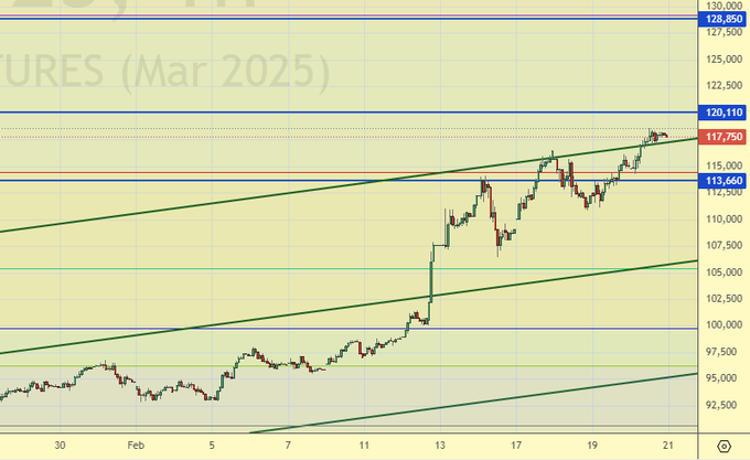 На очереди попытка взятия уровня 120000. Мы сильно перекуплены. Покрывать за день по несколько тысяч пунктов это очень сильная история с некоторой переоценкой ситуации. Технически мы способны пройти к 128000, но без позитивных итогов встречи президентов России и США отметка 128000 вряд ли будет достигнута в обозримом будущем. Следим за новостями.