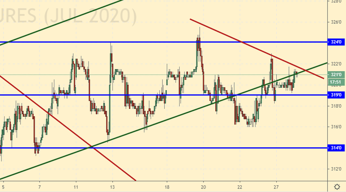 Тестируем пробитый ранее растущий ценовой канал с обратной стороны. Хорошее место для продажи. Несмотря на вторую волну заражения правительства открывают магазины. В том числе в Москве с 1-го июня будет разрешена торговля непродовольственными товарами. Уровень беспокойства в обществе идет на спад, что снижает спрос со стороны тех, кто всё еще обеспокоен сложившейся ситуацией.