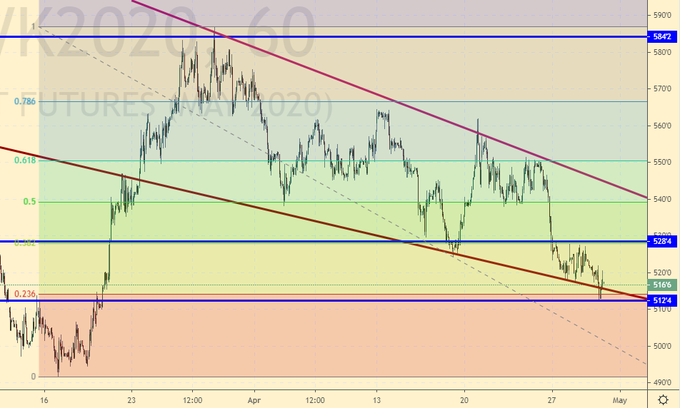 Индекс РТС: вчера рынок рос. Мы прошли все возможные уровни сопротивления и теперь рискуем отправиться к 125000. Таким образом, откат в район 112000 можно использовать для покупок. ГАЗПРОМ заявил о выплате дивидендов по итогам 2019 года, при этом просьбы о господдержке уже появятся через пару месяцев. Возможно, эти дивиденды станут последними, но кто знает, может быть цена на газ вырастет в пять раз и всё будет хорошо. Россию ждет ужасающая статистика за второй квартал. Пока же рынком правят эмоции и оставшиеся свободные деньги.