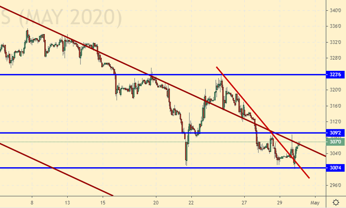 Кукуруза: ушли от 300.0 вверх, что напрашивалось. Пока рассчитываем на движение к 400.00 в следующие два месяца, предполагая, что ограничения, связанные с пандемией, не нанесут структурного вреда экономике. После первой волны заражения цивилизация адаптируются, и люди так или иначе нарастят потребление даже в условиях социального дистанцирования.