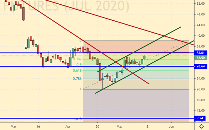 Сценарий роста: рассматриваем июльский фьючерс, дата экспирации 29 мая. Претендуем на прорыв выше 34.00. Держать лонги от 31.50, новых позиций не открывать. В случае прорыва к 35.00 можем уйти на 40.00.