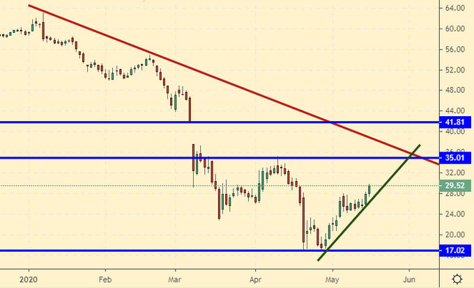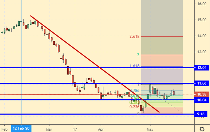 Пока рынок продолжает раздавать авансы нефтяной отрасли, надеясь на снижение влияния пандемии на экономику. С одной стороны, режим изоляции начинают ослаблять, а с другой, пока число заболевших идет в гору, поэтому строить радужные планы по посещению Brent отметки 40.00 крайне тяжело с моральной точки зрения.