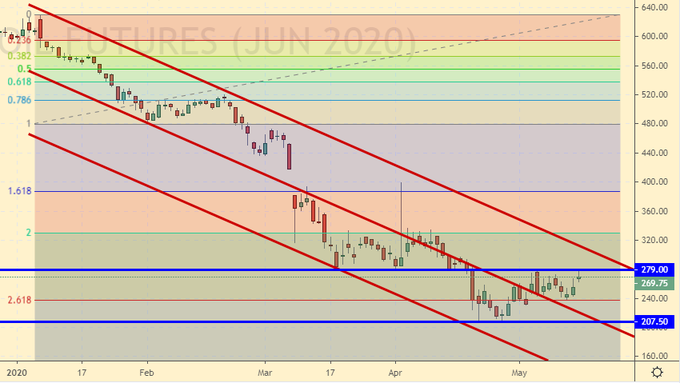 Сценарий роста: рассматриваем июньский фьючерс, дата экспирации 11 июня. Ход выше 280.0 приведет к ходу на 320.0. Это движение лучше отрабатывать на «часовках». В полноценное восстановление рынка не верим.