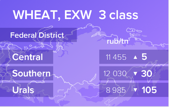 За прошедшую неделю в Центральном федеральном округе внутренние цены на пшеницу 3 класса выросли на 5 руб./т. и на данный момент составляют 11455 рублей за тонну.