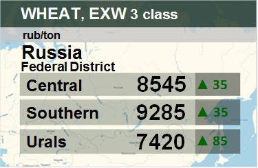 За прошедшую неделю в Центральном федеральном округе внутренние цены на пшеницу 3 класса выросли на 35 руб./т. и на данный момент составляют 8 545 рублей за тонну.