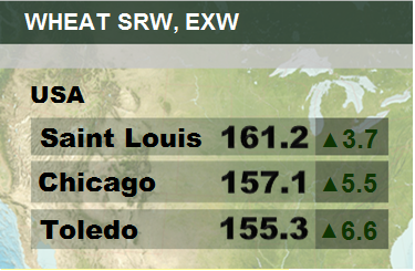 За прошедший месяц внутренние цены на пшеницу SRW в Сент-Луисе (США) выросли на 3.7 $/т. и на отчетный месяц составляют 161.18 доллара за тонну.
