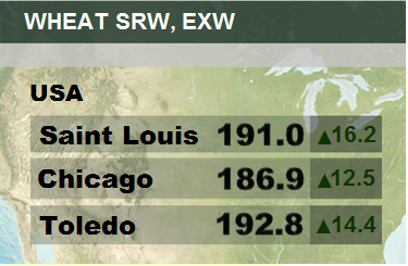 Котировки июльских фьючерсов мягкой пшеницы в Чикаго второй день подряд стремительно снижаются. На торгах в четверг они потеряли еще 3%, опустившись до 3-х недельного минимума. Двухдневные потери составили $12,12. Инвесторы продолжили спекулятивные продажи на фоне осознания того факта, что июньский прогноз USDA относительно падения производства в России не меняет ситуацию обильного предложения пшеницы в мире, в целом. Дополнительное давление на зерновые рынки оказало укрепление доллара США относительно «корзины» основных мировых валют. Июльские котировки американской пшеницы снизились: мягкая пшеница SRW в Чикаго на $5,51 до 184,27 $/тонна; твердая пшеница HRW в Канзас-Сити на $6,16 до 191,89 $/тонна; твердая пшеница HRS в Миннеаполисе на $2,57 до 212,19 $/тонна.