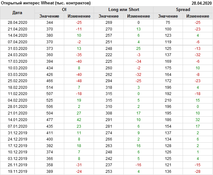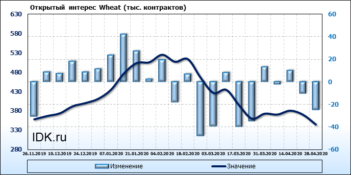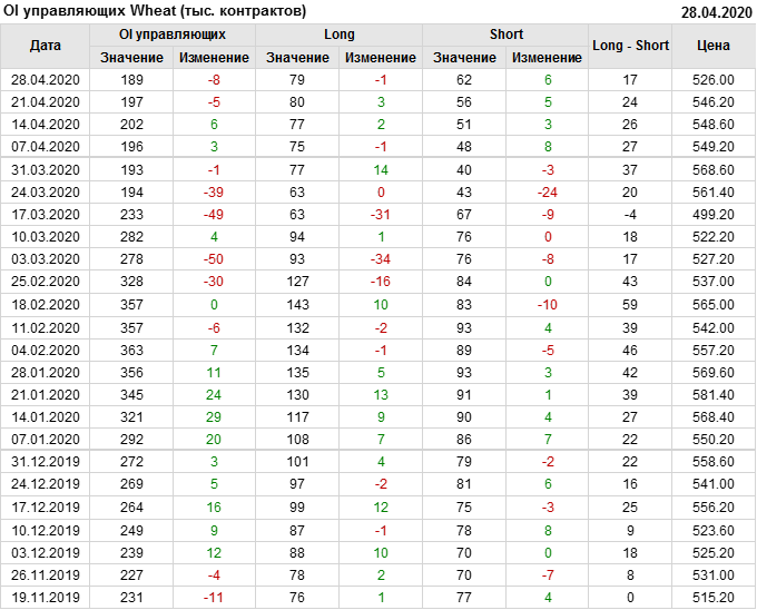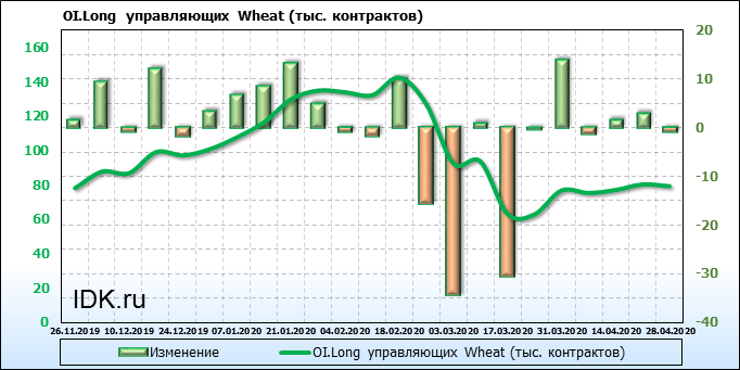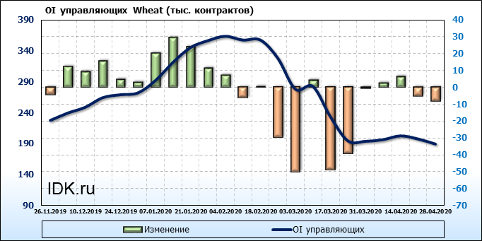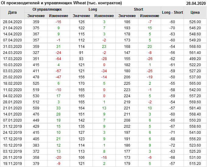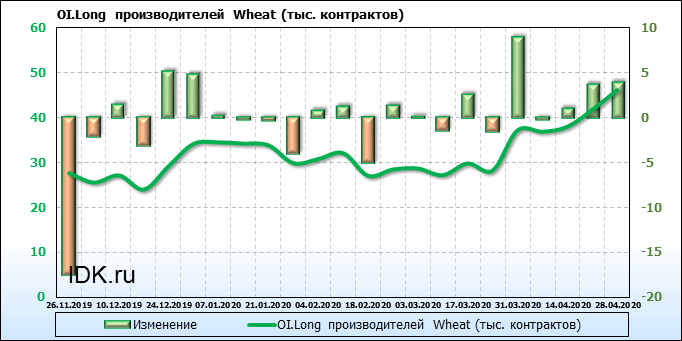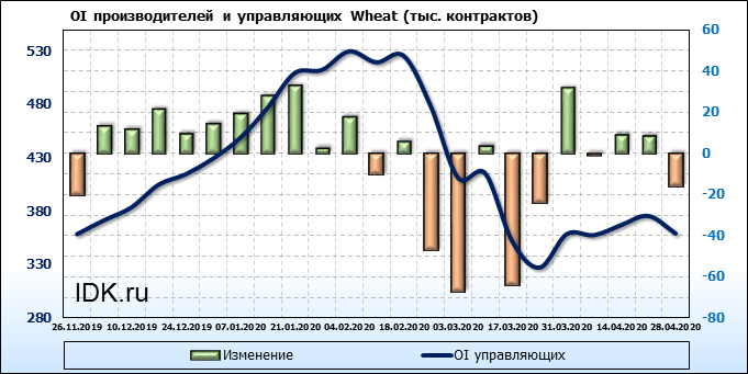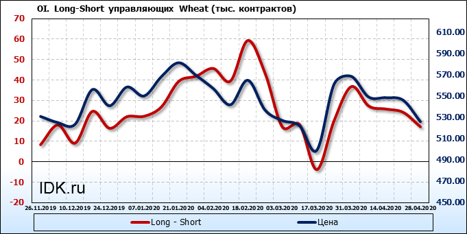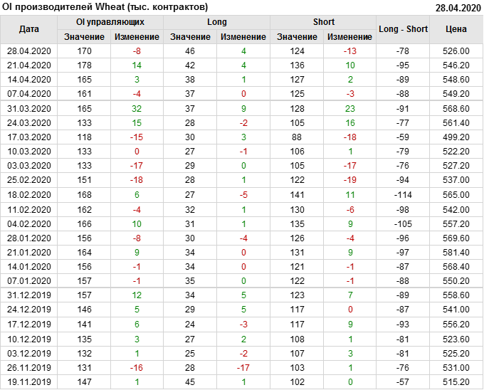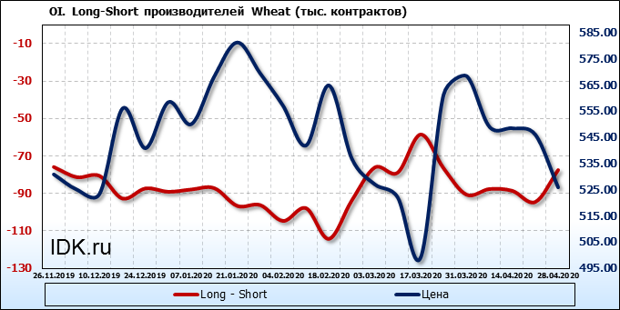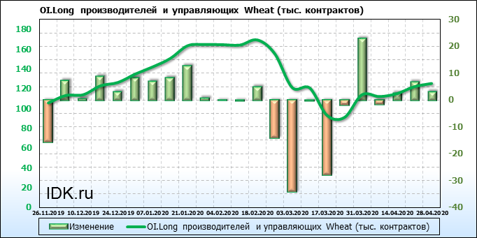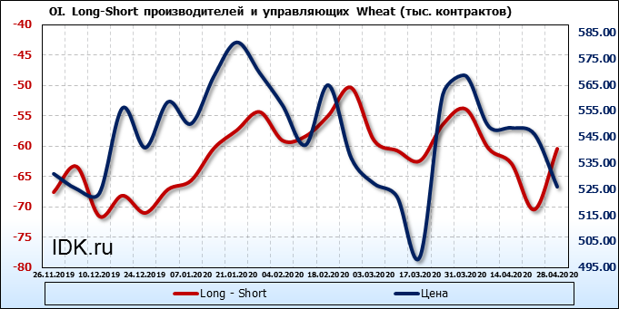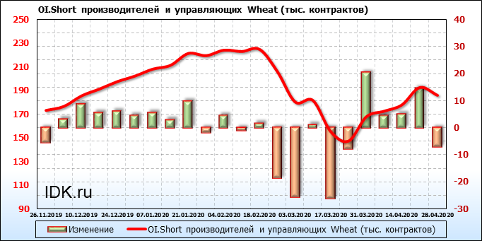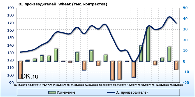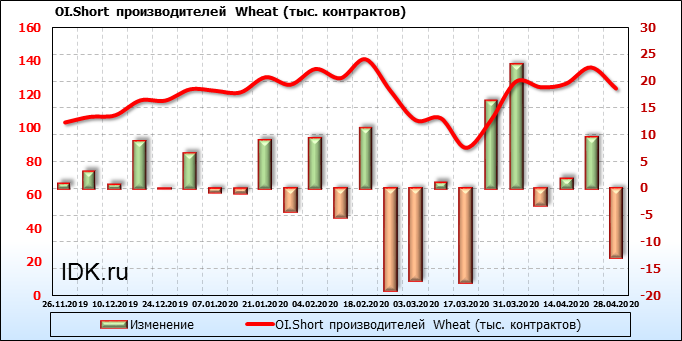 За прошлую неделю, 22.04.20 — 28.04.20, разница между длинными и короткими позициями производителей выросла на 17 тыс. контрактов. В тоже время, цена упала на 20.2 цента. Производители перестали наращивать короткие позиции, что говорит или о непривлекательности текущих ценовых уровней для хеджирования, или о том, что часть участников рынка заняла выжидательную позицию.