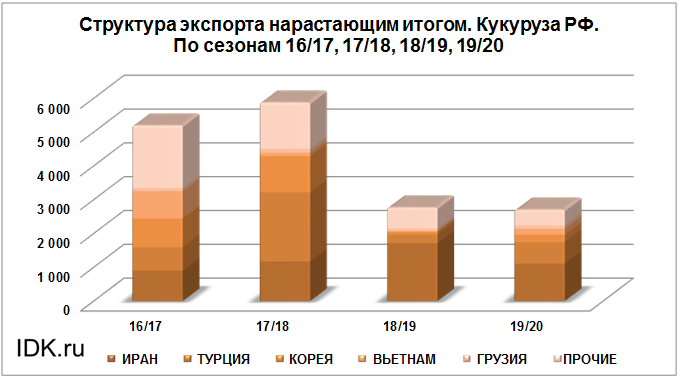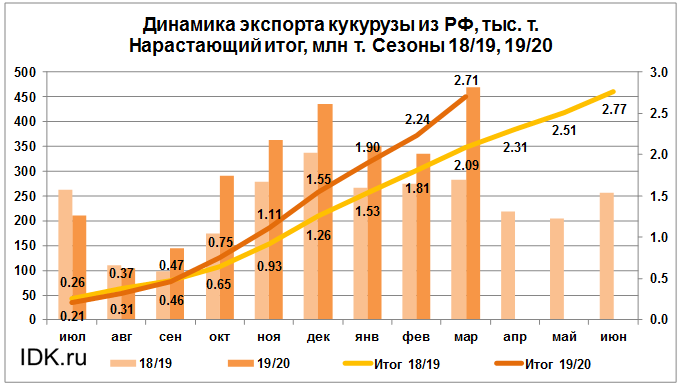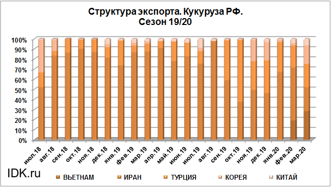 Объем поставок кукурузы на экспорт за период с июля 2019 года по март 2020 года в Корею составил 221 тыс. тонн, что на 132.8 тыс. тонн больше объема поставок в данную страну в прошлом сезоне на тот же отчетный месяц.