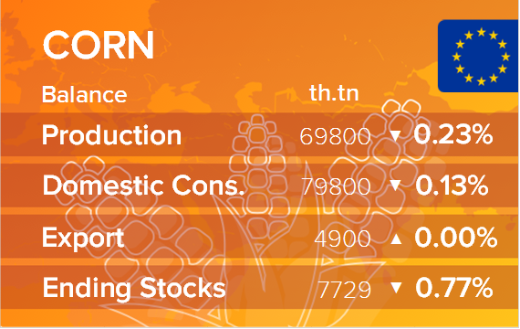 Производство кукурузы в Европейском союзе (ЕС) в 2021/22 маркетинговом году оценивается в 69,80 млн метрических тонн, что представляет собой небольшое снижение прогноза по сравнению с прошлым месяцем, но на 2,71 млн тонн или 4,04 процентов больше по сравнению с прошлым годом. Уборочная площадь сокращена с 9,31 до 9,23 миллиона гектаров. Урожайность повышена с прошлого месяца с 7,52 до 7,56 тонны с гектара, что почти на 5 процентов выше, чем в прошлом году. Прогноз импорта кукурузы в ЕС в 2021/22 году не изменился и составляет 15 млн тонн.