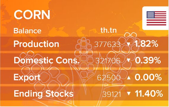 В обновленных ежемесячных оценках спроса и предложения министерство снизило среднюю оценку урожайности. Несмотря на то, что оно было частично компенсировано увеличением посевных площадей (на 81 тыс. гектаров), более низкая урожайность снизила оценку производства кукурузы на 3% по сравнению с годом ранее.