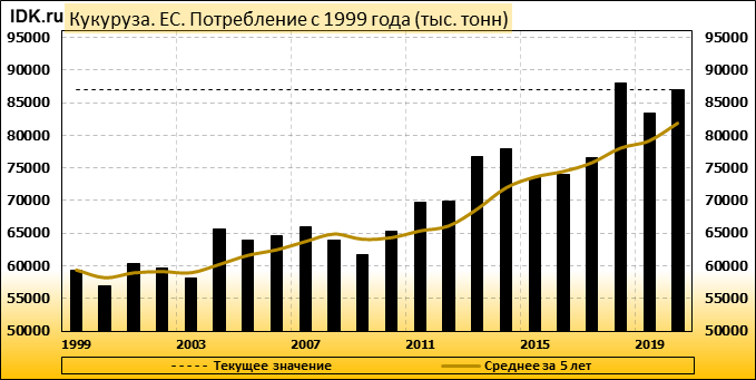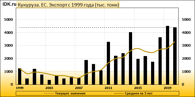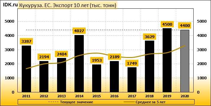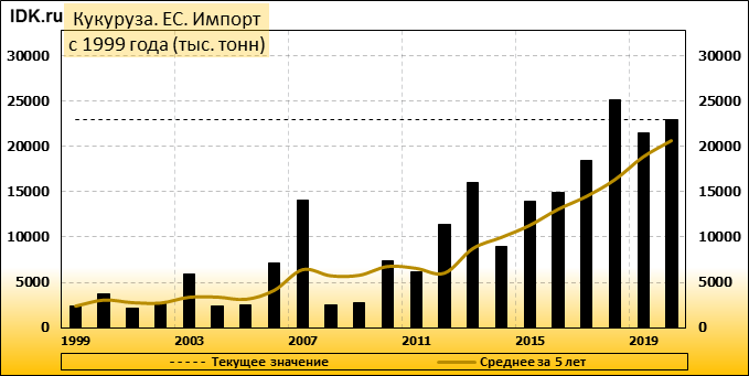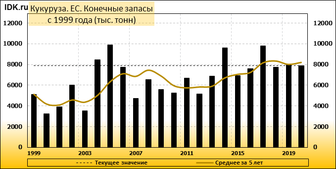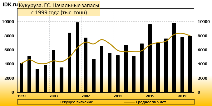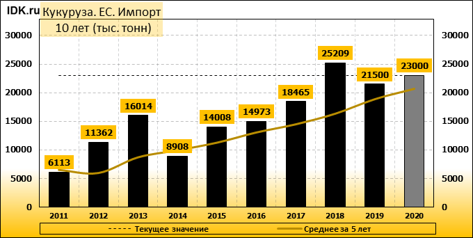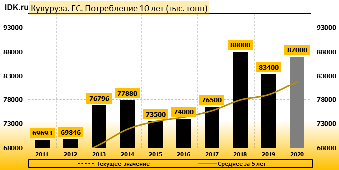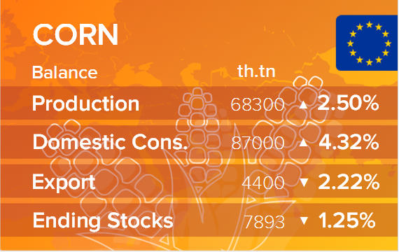 Ожидается, что импорт кукурузы в Европейский Союз в 2020/21 году увеличится на 1,5 млн. тонн до 23,0 млн., чтобы частично компенсировать сокращение запасов пшеницы кормового качества. Пшеница ранее была основным зерном, используемым в качестве корма; тем не менее, в последние несколько лет кукуруза опередила пшеницу в основном из-за соотношения цен. Ожидается, что в связи с обильными запасами на мировом рынке кукуруза будет конкурентоспособной по цене по сравнению с пшеницей. Экспорт кукурузы из Европейского Союза, согласно прогнозу, сократится на 100 000 тонн до 4,4 млн., что отражает ожидание больших запасов в ключевых странах-производителях в Юго-Восточной Европе.