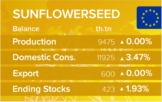 Страны ЕС традиционно полагались на то, что Украина будет поставлять более 40% импорта подсолнечного масла. Большинство семян подсолнечника в ЕС измельчают для производства растительного масла, которое в основном используется в пищевой промышленности и для производства биотоплива. Посевные площади под подсолнечником в ЕС были увеличены на 1% в этом году, что чуть меньше рекордного уровня посевных площадей 2013 года, чтобы увеличить внутреннее производство и частично компенсировать заблокированный экспорт Украины.