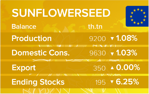 Министерство сельского хозяйства США прогнозирует, что производство подсолнечника в Европейском Союзе в 2020/21 году составит 9,20 млн. метрических тонн, что на 0,10 млн. тонн (1,08 процента) меньше по сравнению с прогнозом прошлого месяца и на 440 тыс. тонн меньше, чем было произведено в предыдущем году.