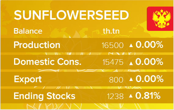 Согласно второй оценке ведомства, урожай семян подсолнечника в 2022 году по сравнению с 2021 годом в весе после доработки снизился на 7,5%, до 14,486 миллиона тонн (первая оценка была 15,342 миллиона). Между тем, посевные площади под этой культурой выросли на 3,9%, до 10,136 миллиона гектаров.