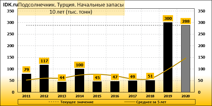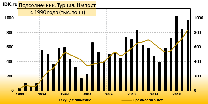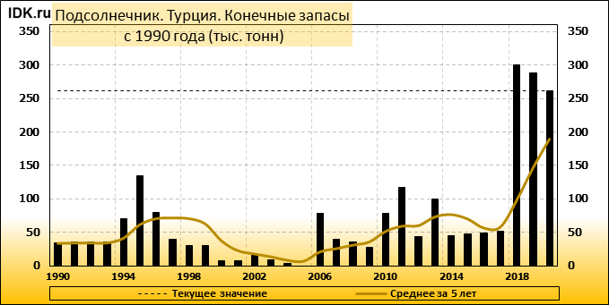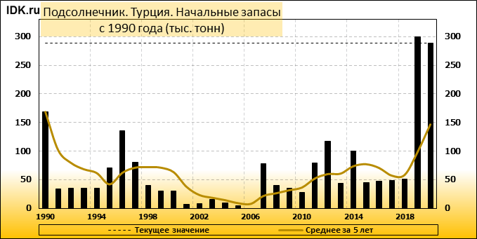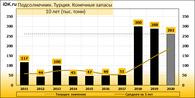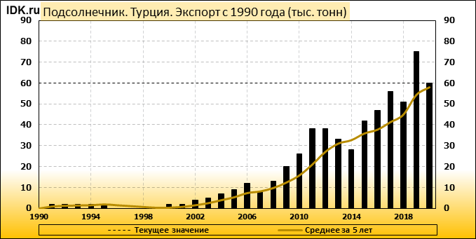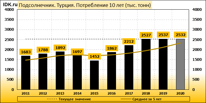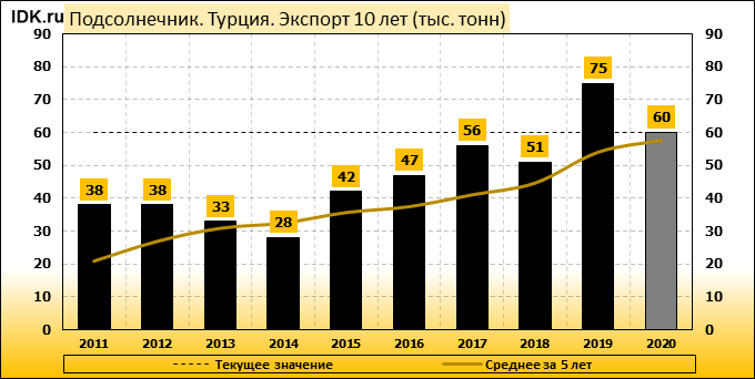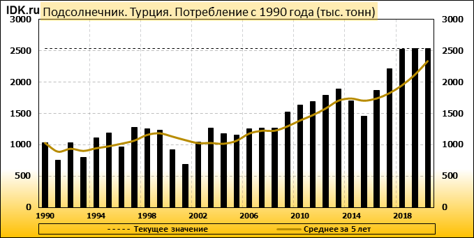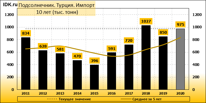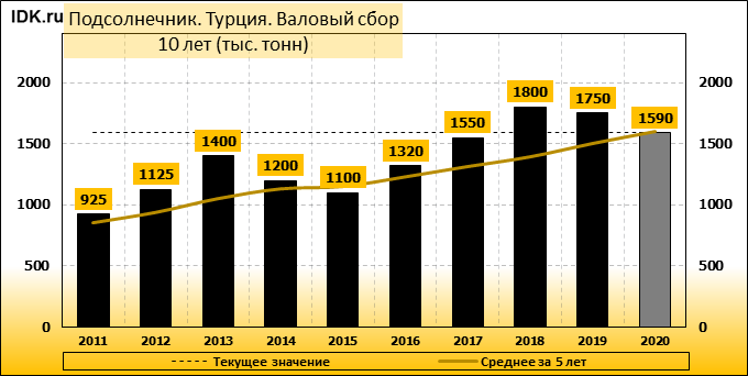 Министерство сельского хозяйства США прогнозирует, что производство подсолнечника в Турции в 2020/21 году составит 1,59 млн. метрических тонн, что на 0,16 млн. тонн или 9,14 процента меньше, чем в предыдущем году. Уборочная площадь оценивается в 0,70 млн. га, что на 0,03 млн. га или 4 процента меньше прошлогоднего показателя. Согласно прогнозу, урожайность подсолнечника в Турции резко снизится с 2,40 до 2,27 тонны с гектара. Ожидается, что при этом импорт подсолнечника в Турцию увеличится с 850 тыс. до 975 тыс. тонн.