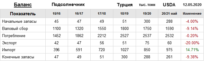 USDA. Баланс по подсолнечнику на 19 мая 2020. Турция
