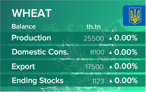 Прогноз производства пшеницы в Украине в 2020/21 году не изменился с прошлого месяца и составляет 25,5 миллиона метрических тонн, что на 3,67 млн. тонн или 12,58 процентов меньше, чем было произведено в прошлом году. Оценки урожайности и уборочной площади также не изменились по сравнению с прошлым месяцем. Урожайность оценивается в 3,75 тонны с гектара, уборочная площадь - в 6,8 миллиона гектаров, что на 3 процента меньше, чем в прошлом году. Прогноз по экспорту пшеницы из Украины в 2020/21 году остался без изменений и составляет 17,5 млн. тонн.