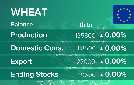 Оценки урожайности и уборочной площади также не изменились по сравнению с прошлым месяцем. Урожайность оценивается в 5,52 тонны с гектара, уборочная площадь - в 24,61 миллиона гектаров. Прогноз по экспорту пшеницы из ЕС в 2020/21 году, как и прошлом месяце, остается на уровне 27 млн. тонн.