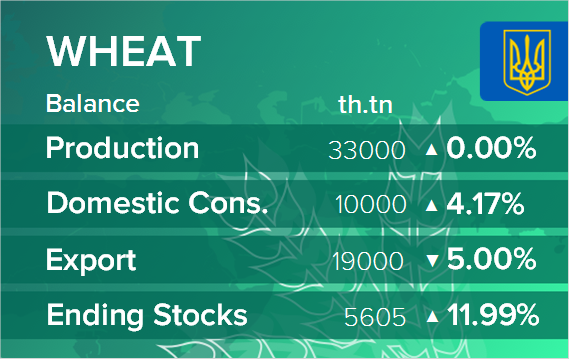 Согласно апрельскому отчету МСХ США, прогноз производства пшеницы в Украине в 2021/22 маркетинговом году не изменился по сравнению с прошлым месяцем и составляет 33,00 млн тонн, что на 7,58 млн тонн или почти 30 процентов больше, чем было произведено в предыдущем году. Урожайность, как и в прошлом месяце, прогнозируется на уровне 4,46 тонны с гектара. Уборочная площадь также не изменилась и оценивается в 7,40 миллиона гектаров. Экспорт пшеницы из Украины вновь снижен на 1,0 млн тонн до 19,0 млн из-за невозможности доставки через морские порты.